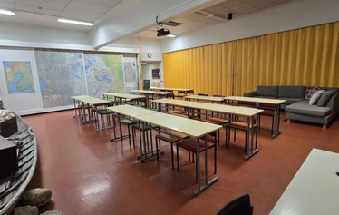Kokoustilan kalusteet voidaan järjestellä tarpeenne mukaan. Tila soveltuu niin luokkamuotoiseen työskentelyyn, U-malliin kuin rennompiin keskusteluryhmiin. Tilan käytön jälkeen kalusteet tulee palauttaa ennalleen.